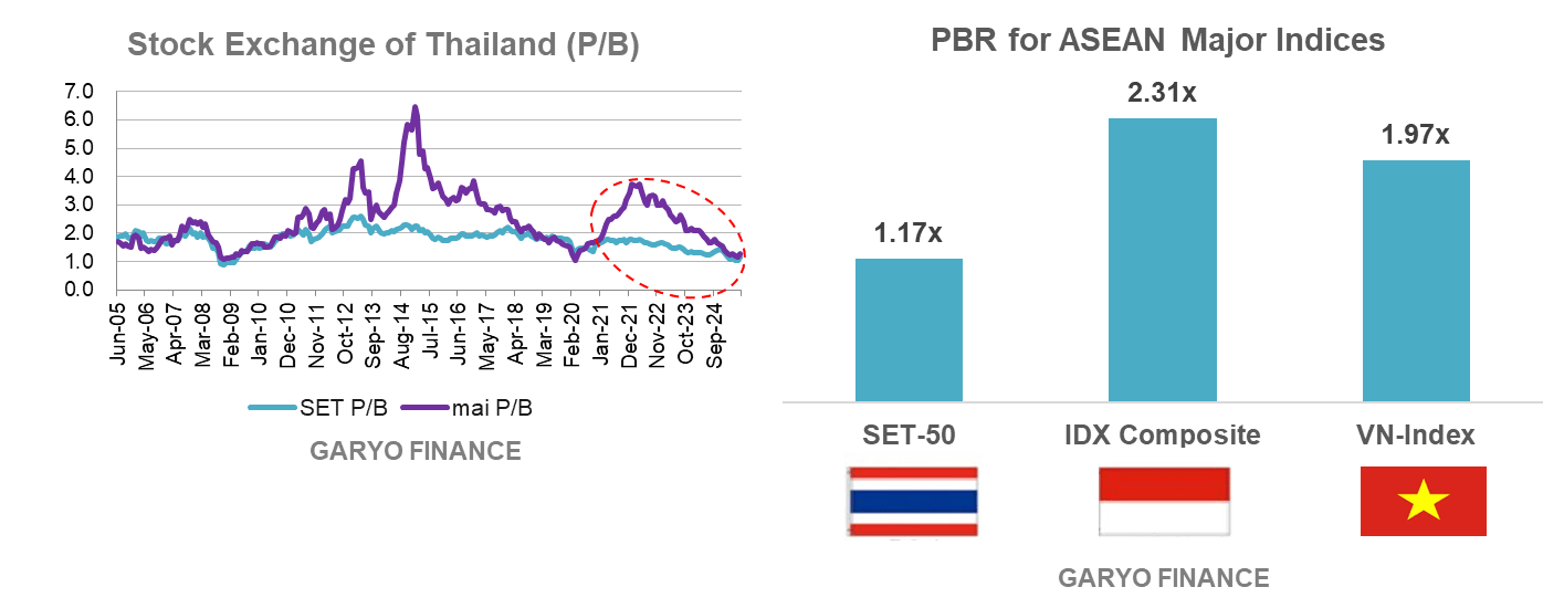 Thailand’s stock market has long been considered “cheap.” But today’s discount is no longer cyclical — it has become structural. The SET index trades at just 1.0x book value, the lowest in decades, compared with around 2.0x in Vietnam and more than 2.3x in Indonesia.
