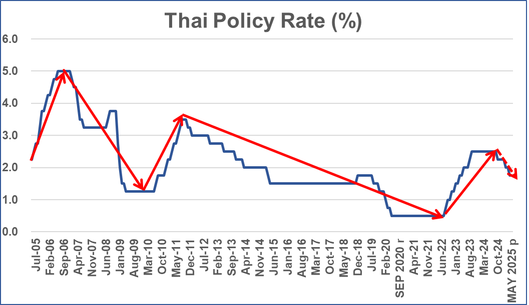 2024–25 (New easing cycle): Since late 2024, rates have trended down toward 1.75%. If history is a guide, the baht is unlikely to weaken much.